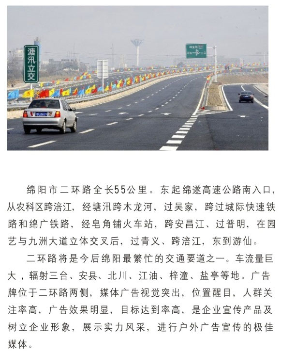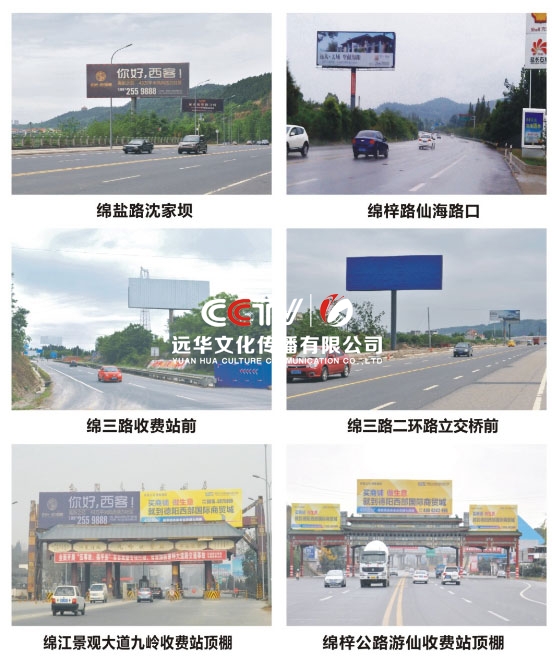 公司擁有單立柱及戶外大牌100余個(gè),分布在成綿高速磨家收費(fèi)站、綿鹽路、綿三路、綿江路、綿梓路、綿陽農(nóng)科區(qū)、綿安路、科學(xué)城、二環(huán)路等。可應(yīng)客戶需求建立、審批、發(fā)布戶外單立柱廣告牌。