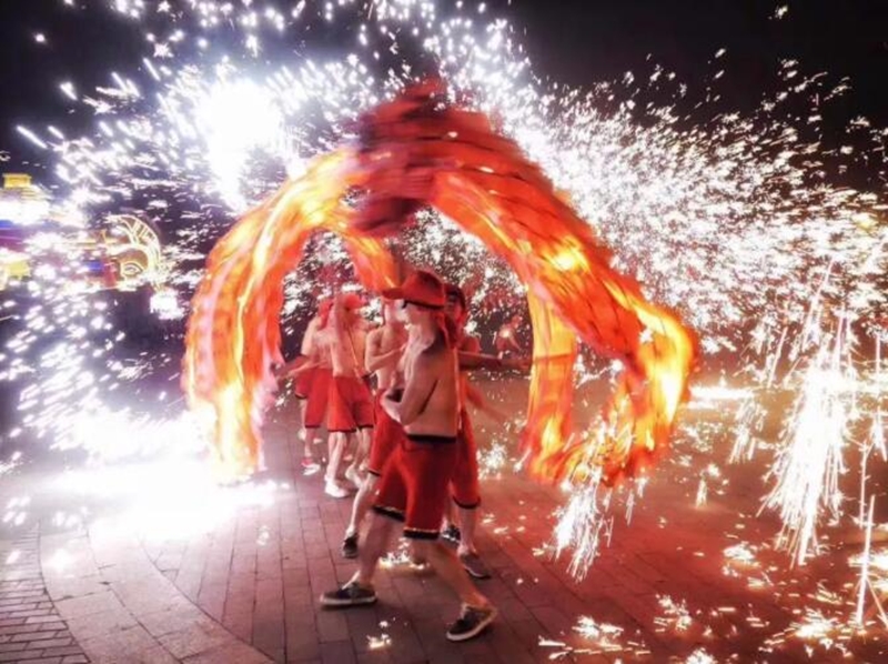 1500多度的鐵水灑向天空,瞬間綻放成奪目的鐵水流星雨,赤膊的漢子在飛舞的火花間翻轉(zhuǎn)騰挪,手舞巨龍奔跑騰躍,上下回旋,內(nèi)外穿花,構(gòu)造了一幅“人在龍中舞,龍在火中飛”的奇美畫面。